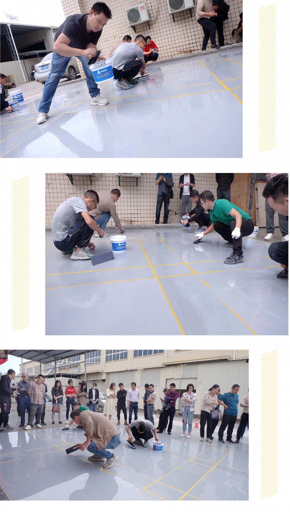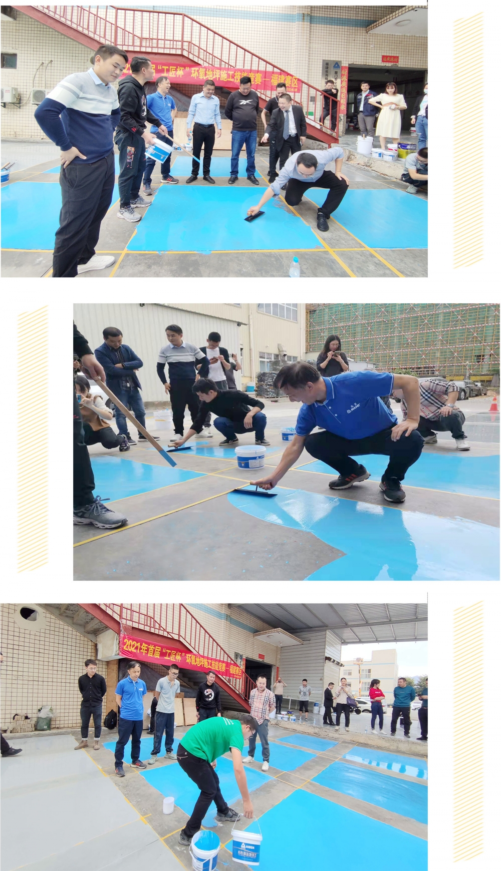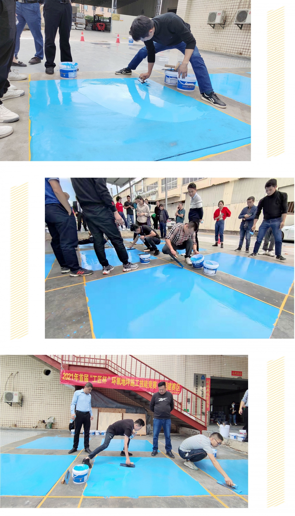 競(jìng)賽用的地坪漆是由安必信提供的水性環(huán)氧自流平(灰色)和水性環(huán)氧砂漿中涂(藍(lán)色),批刀工具由安福茂地坪提供。